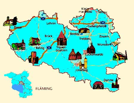 Fläming - das Burgenland. Der Name stammt von flämischen Siedlern aus dem 12. Jahrhundert. Aus dieser Zeit sind auch noch einige Burgen vorhanden. Bekannt und auch aus dem Mittelalter, das Kloster Zinna mit einer Dauerausstellung über die Geschichte des Zisterzienserordens und einer Schaudestille Zinnaer Klosterbruder. |