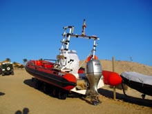 Blick vom Norden auf die Hotelanlage. | Dieser Motor hat 225 PS, unglaublich eigentlich für dieses Boot der Tauchschule, bei dem hiesigen Wind und den Wellen wahrscheinlich notwendig. | |||