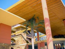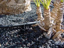 Auf Fuerteventura hat fast jede Pflanze einen eigenen Wasserhahn. Überall liegen diese Schläuche, an den Wegrändern, über Berge, in den Hotelanlagen. | Wer war zuerst hier, die Palme oder das Dach? | |||