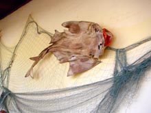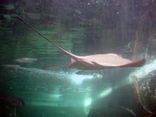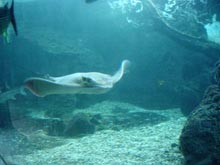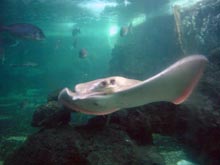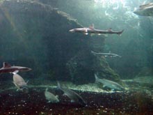 Am 28. Dezember 2006. In unserem Reiseführer hatten wir gelesen, dass es in Tarajalejo ein Meerwasseraquarium gibt. Wieder einmal irrten wir durch einen Ort, ohne auch nur einen Hinweis auf dieses Aquarium zu sehen. Wir wollten schon fast aufgeben, es wäre ja nicht der erste Fall, dass der Reiseführer nicht aktuell war. Dann sahen wir, dass dieser Ort auf der westlichen Seite der ihn durchquerenden Hauptstraße weiter ging. Dort fuhren wir auch etwas planlos rum, bis wir durch Zufall ein kleines Schild am Zaun fanden, dort war es auch. Als wir in dem Restaurant, welches zum Aquarium gehört, die Eintrittskarten kauften (4,50 Euro), gab es den Hinweis, es sei ein sehr kleines Aquarium. Damit auf alles gefasst, betraten wir einen Raum und sahen ein Becken, ca. 4 x 3 m, weiter nichts. Während ich noch, durch die doch recht ungepflegten Scheiben, nach besonderen Fischen suchte, erkundete Lutz die weiteren Räumlichkeiten. Es ging natürlich noch weiter und es gab noch weitere Becken. Am Ende ging es dann in den Garten. Dort war ein kleiner Teich mit Kois und einem Zettel mit der Bitte, diese zu füttern. Trockenes Brot lag auch auf dem Beckenrand. An der gegenüberliegenden Wand hing eine getrocknete Haut von einem Engelshai, den wir bei unsere U-Bootfahrt gesehen hatten. Über diesem Tier stand auf der Wand: "Bitte ertasten Sie die Sandpapierhaut der Haie". Wieder einmal sind uns die Unterschiede zu Deutschland aufgefallen. Von hier kennen wir nur:"Bitte nicht füttern." und "Bitte nicht anfassen.". |