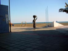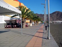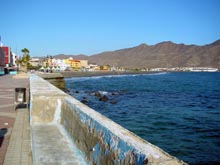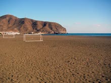 Gran Tarajal ist an der Küste recht langgezogen. Am Ende, vor den Bergen im Hintergrund, wurde auf einer Mole geangelt, mit Erfolg. Es waren recht kleine Fische, welche in dem klaren Wasser gut zu sehen waren. | Ein Fußballfeld direkt am Meer. Der Strand ist nicht schwarz, aber doch sehr dunkel, was auf diesem Foto leider nicht richtig zu sehen ist. | |||